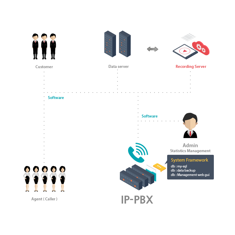 녹취파일 관리, 일/월별 회원관리, 상담원/회선별 다양한 통계기능, 실시간 요금관리 등